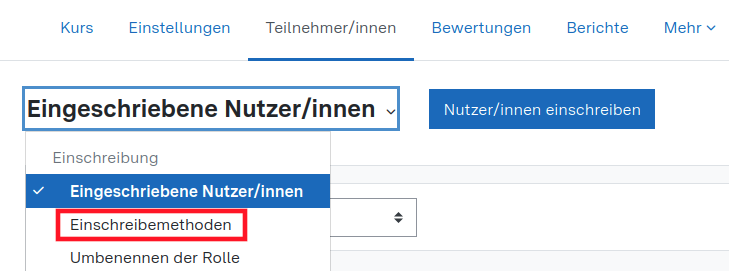 3. Klicken Sie auf den Text "Eingeschriebene Nutzer/innen" und dann auf "Einschreibemethoden" , siehe folgenden Screenshot: