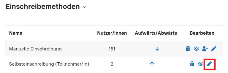 4. Klicken Sie am Ende der Zeile "Selbsteinschreibung (Teilnehmer/in)" auf das Stiftsymbol, siehe folgenden Screenshot: